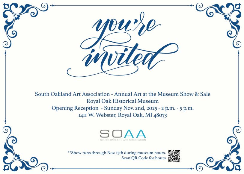 SOAA Members will be displaying and selling their art at the Royal Oak Historical Society Museum from Nov 1 - 15, 2025.